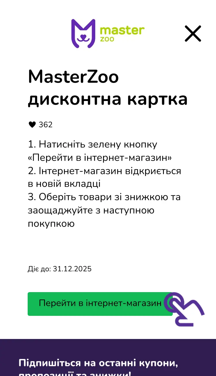 Натисніть «Перейти в інтернет-магазин», і вас буде перенаправлено на сторінку MasterZoo, де представлені акції або товари зі знижками. Тепер ви можете почати купувати зі знижкою!