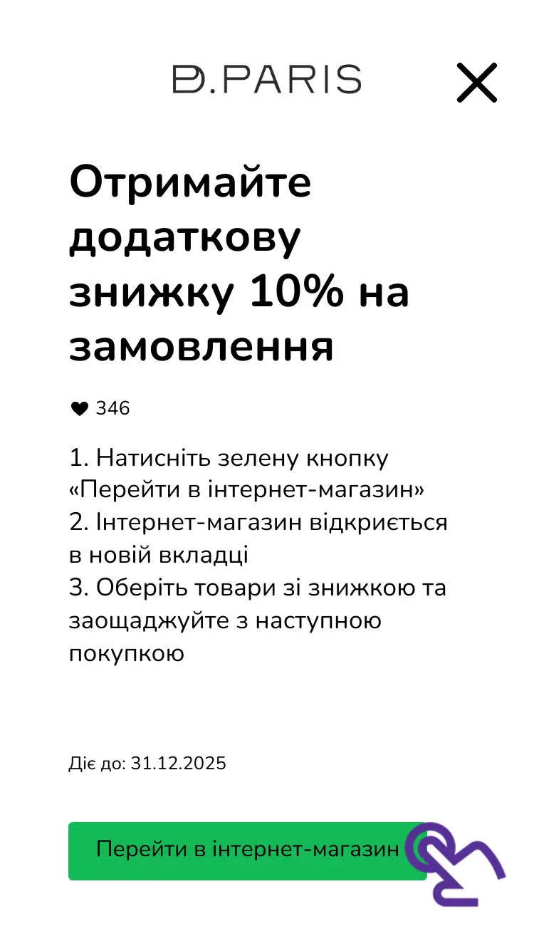 Натисніть «Перейти в інтернет-магазин», і вас буде перенаправлено на сторінку PD.Paris, де представлені акції або товари зі знижками. Тепер ви можете почати купувати зі знижкою!